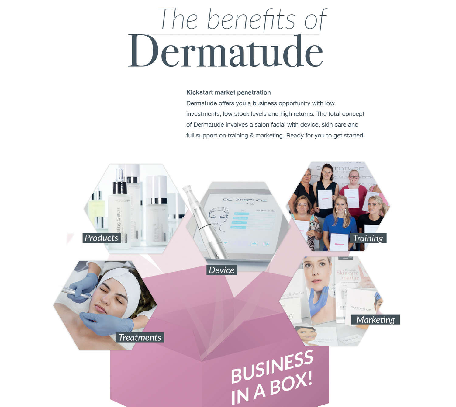 Dermatude’s total skinbooster concept includes the device, salon & retail products, treatment protocols, training resources and marketing collateral you need for a successful business. Dermatude is a ready to launch ‘business in a box’.