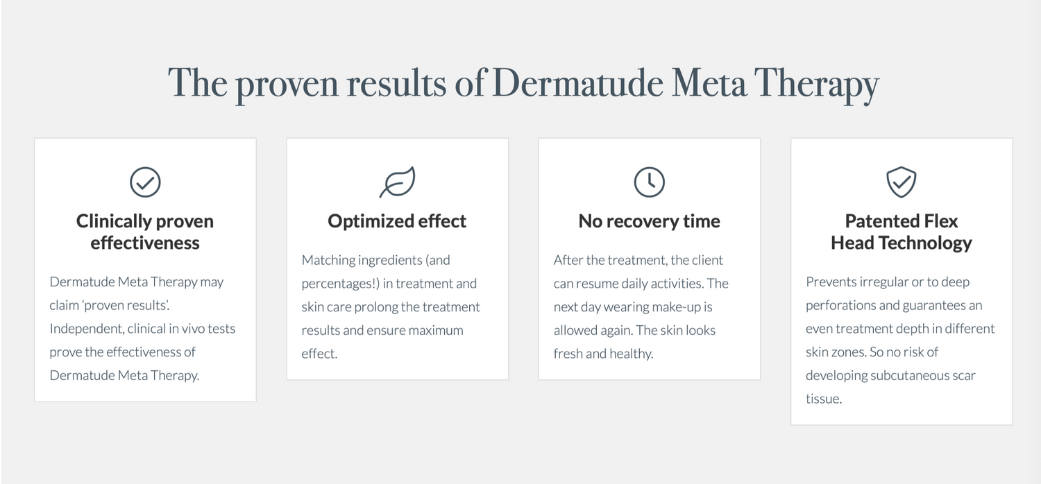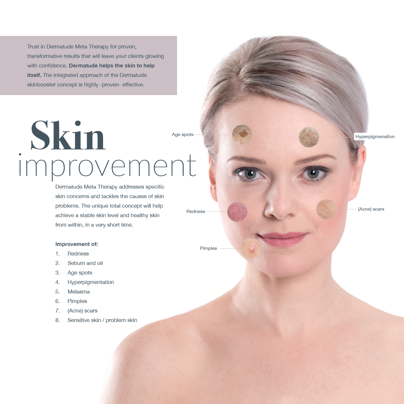 Dermatude's goal is to achieve optimal results and to fight the ageing process successfully in a 100% natural way. Dermatude Meta Therapy is a clinically proven skinbooster treatment concept that improves the overall condition of the skin, achieving healthy skin and the perfect glow.